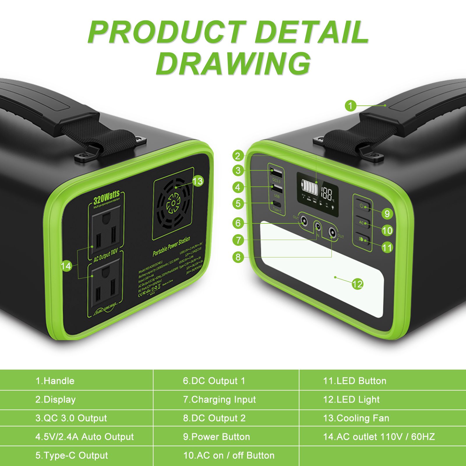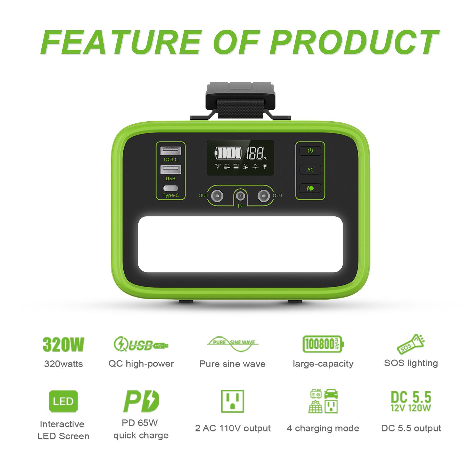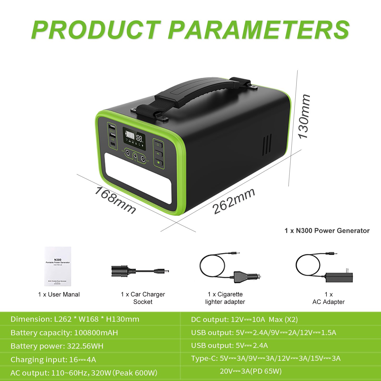 * Battery : 307.2Wh LiFePO4 Lithium Iron Phosphate Battery 96000mAh