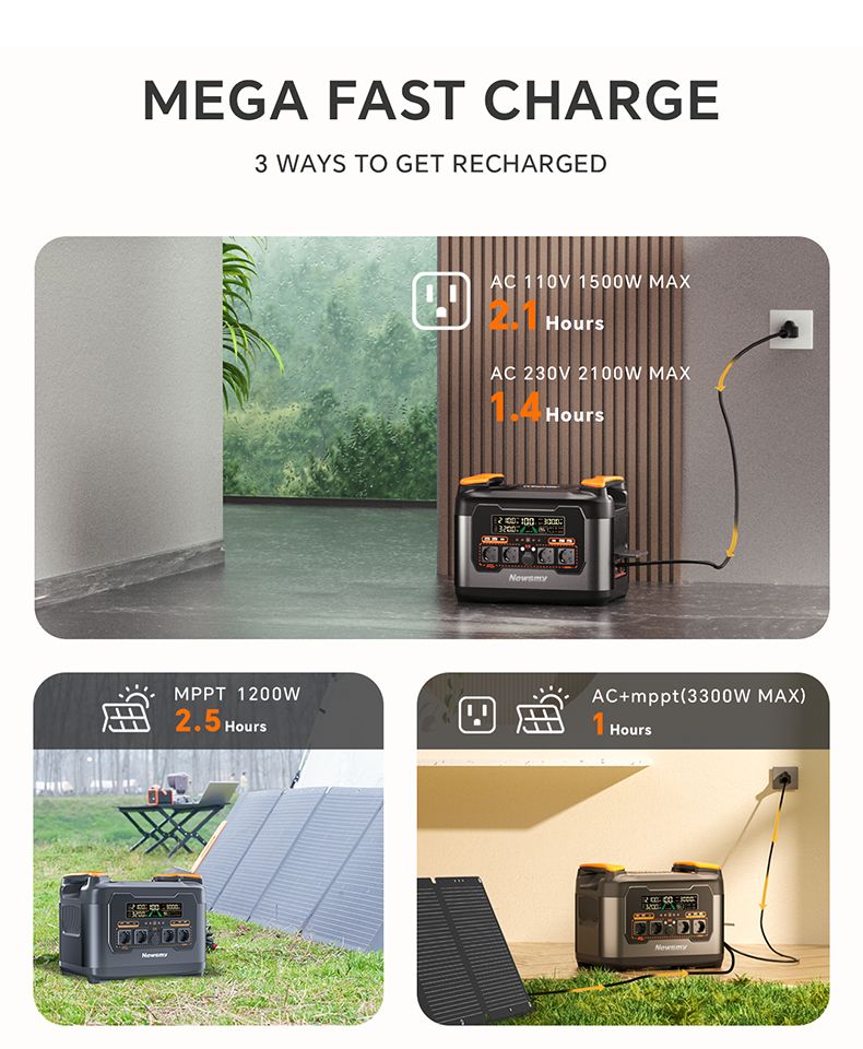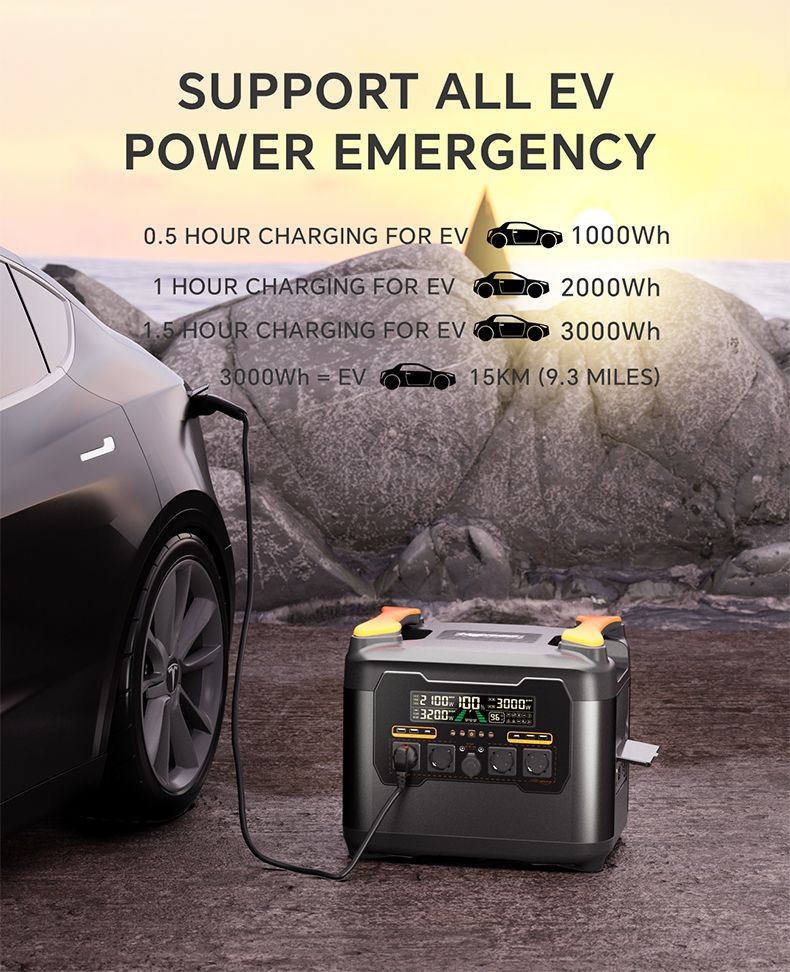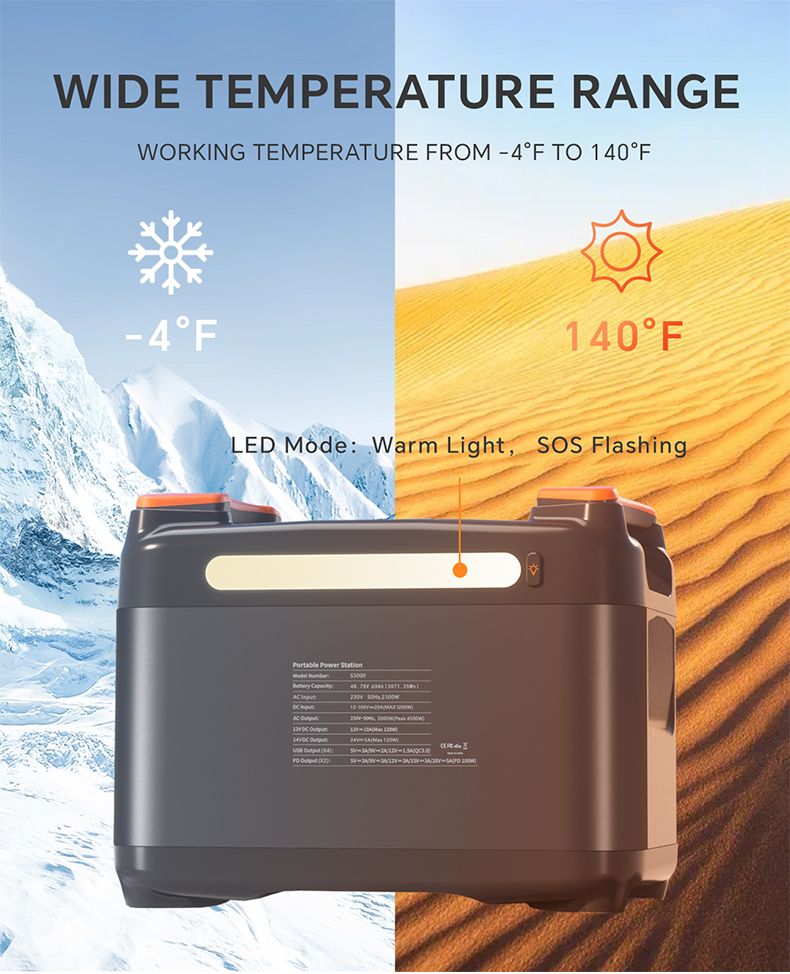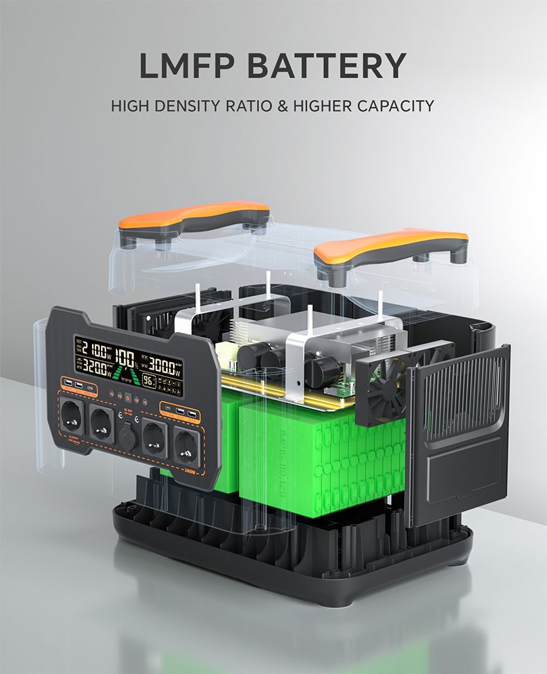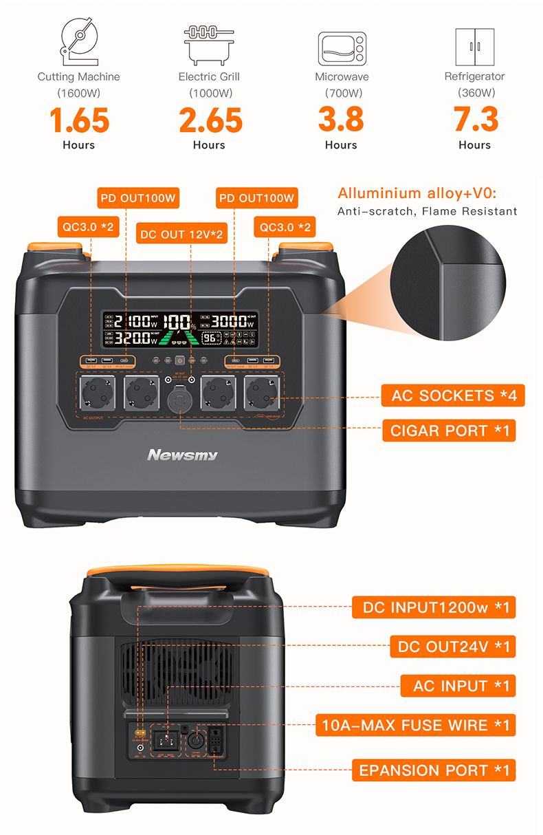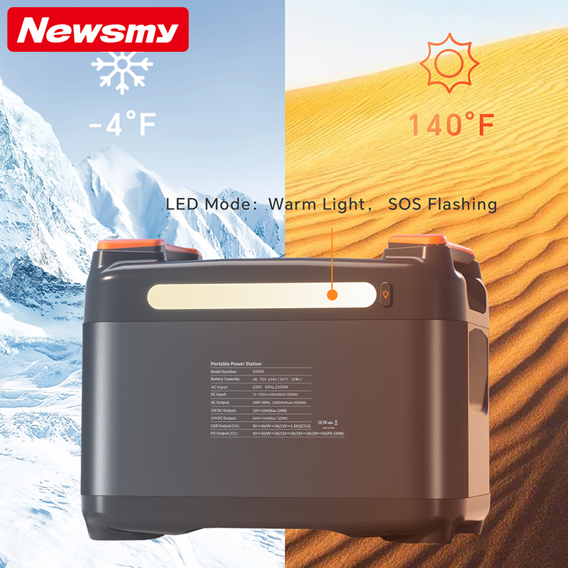 * Dimension:432MM*296MM*369MM* Material:Flame retardant plastic * Rated capacity: 2925Wh (LMFP)* Battery capacity: LMFP 48.75V 60A (LMFP)* Output: 1. 4*USB port:QC3.0 2. 2*PD100W 3. Cigarette light*1 4. 2*DC-Out port (10A) 5. 4*AC220V/110V, 300W-600W pure sine wave* Charging Input: 1.DC 16V/4A 2. PD100W AC+mppt 3300w Fully Charging time: about 1HLED light: 6W (red/white warning light)